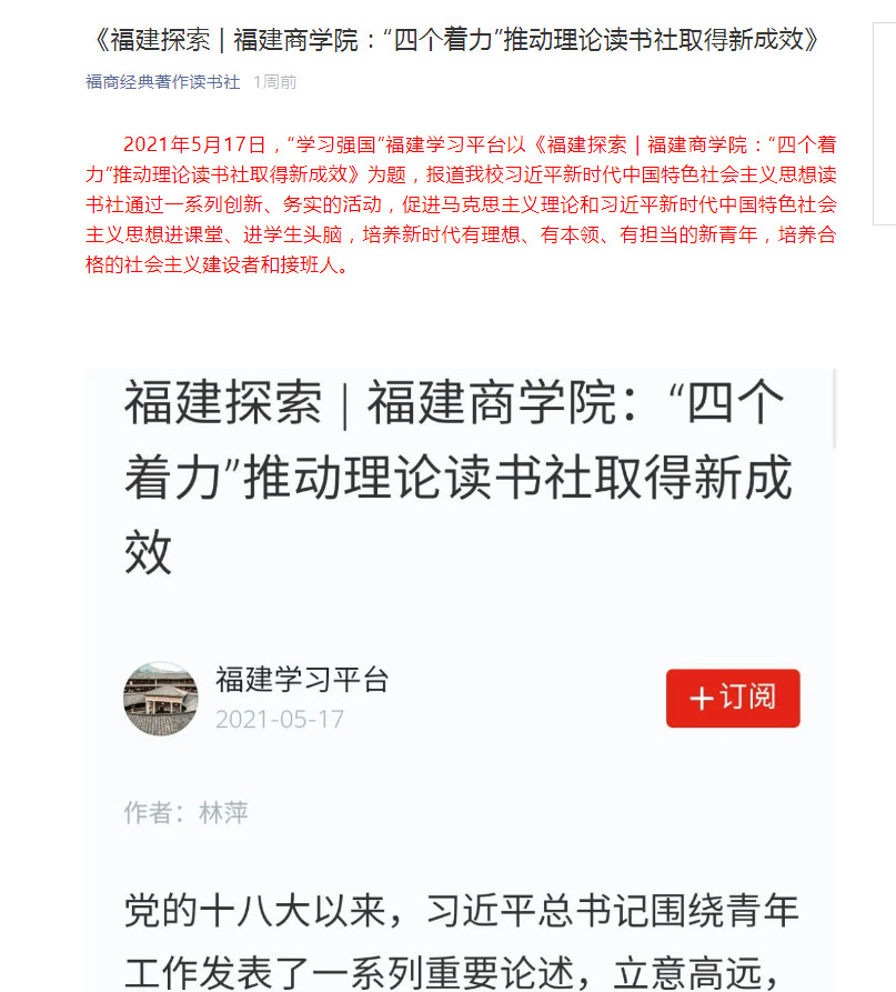 2021年5月17日,“学习强国”福建学习平台以《福建探索 | 福建商437ccm·必赢国际:“四个着力”推动理论读书社取得新成效》为题,报道我校习近平新时代中国特色社会主义思想读书社通过一系列创新、务实的活动,促进马克思主义理论和习近平新时代中国特色社会主义思想进课堂、进学生头脑,培养新时代有理想、有本领、有担当的新青年,培养合格的社会主义建设者和接班人。