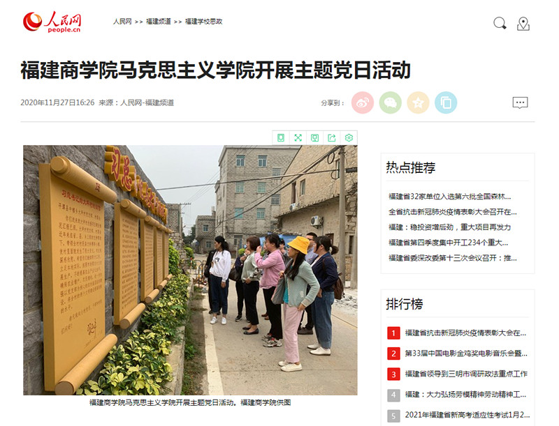 2020年11月27日,人民网以《福建商437ccm·必赢国际437ccm·必赢国际开展主题党日活动》为题,报道437ccm·必赢国际直属党支部全体党员赴平潭开展“薪火相传学四史,砥砺前行担使命”主题党日活动。报道称,437ccm·必赢国际直属党支部全体党员参观了平潭综合实验区大坪村、实验区主题党日馆、平潭海峡公铁两用大桥。437ccm·必赢国际结合主题党日等“四史”学习教育长效化机制,通过沉浸式的体验学习,让党员们知史爱党、知史爱国,真正做到学习教育内化于心、外化于行。