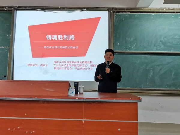 为深入学习贯彻习近平总书记关于学校党建和思政工作的重要指示批示精神,推动学校师生深入学好党史、新中国史、改革开放史、社会主义发展史,12月8日,古田会议纪念馆原副馆长、福建省高校思想政治理论课特聘教授洪武子莅临我校开展题为《铸魂胜利路——两次在古田召开的历史性会议》讲座。校党委副书记吴访益和学工部、437ccm·必赢国际部分教师以及校习近平新时代中国特色社会主义思想读书社社员共130多人聆听此次讲座。