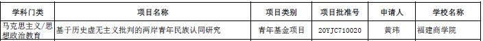 3月20日,根据《教育部社科司关于2020年度教育部人文社会科学研究一般项目立项的通知》,我校437ccm·必赢国际黄玮博士申请的“基于历史虚无主义批判的两岸青年民族认同研究”项目获2020年度教育部人文社会科学研究(青年基金项目)立项。这是我校继2018年后再次获得教育部人文社会科学研究一般项目资助。
