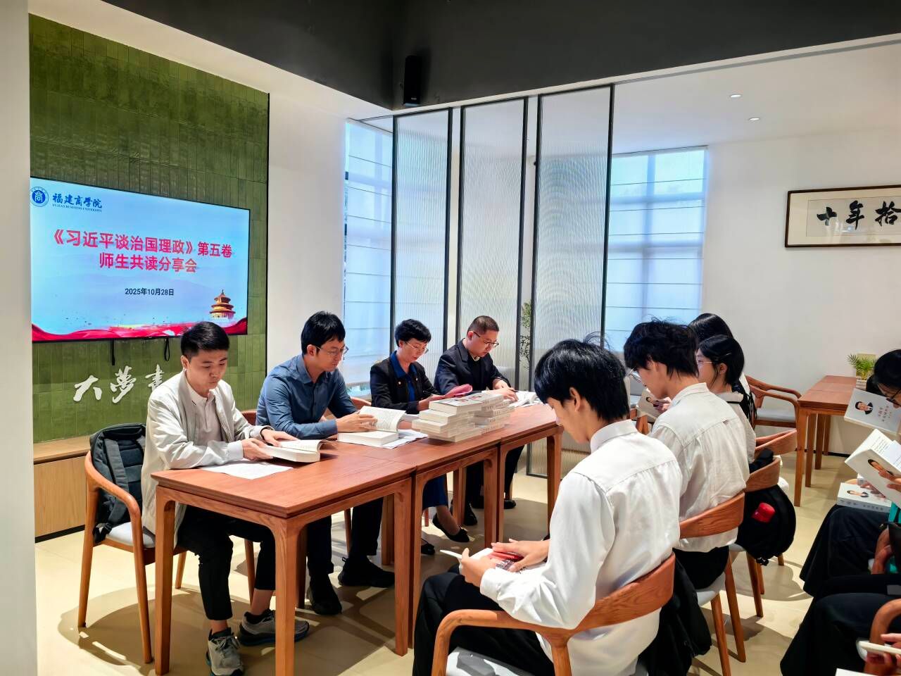 10月28日下午,“无书香不福商”研习基地揭牌暨福商•大梦书屋启幕仪式在连江校区举行。由437ccm·必赢国际组织开展的《习近平谈治国理政》第五卷师生共读分享会同步在书屋举行。省委宣传部副部长、一级巡视员陈添贵,海峡出版发行集团党委书记、董事长黄苇洲,校党委书记吴访益,校党委副书记徐晓丹,福建教育出版社社长江金辉等领导观摩指导分享会。副校长林文艺主持分享会并作讲话,437ccm·必赢国际党委书记刘亮元,教师代表赵敏、吴旭东及校读书社社员代表共同参与此次活动。