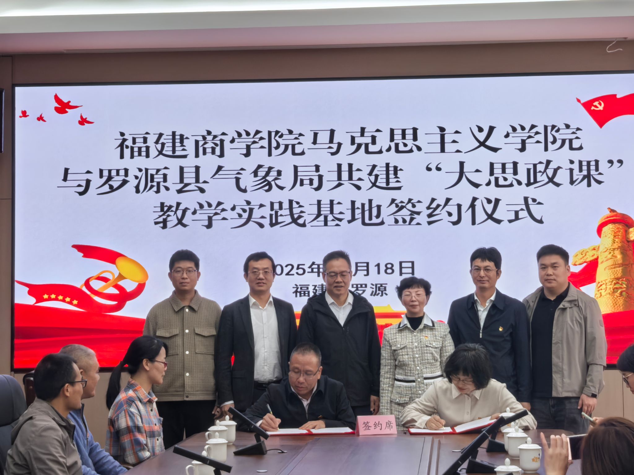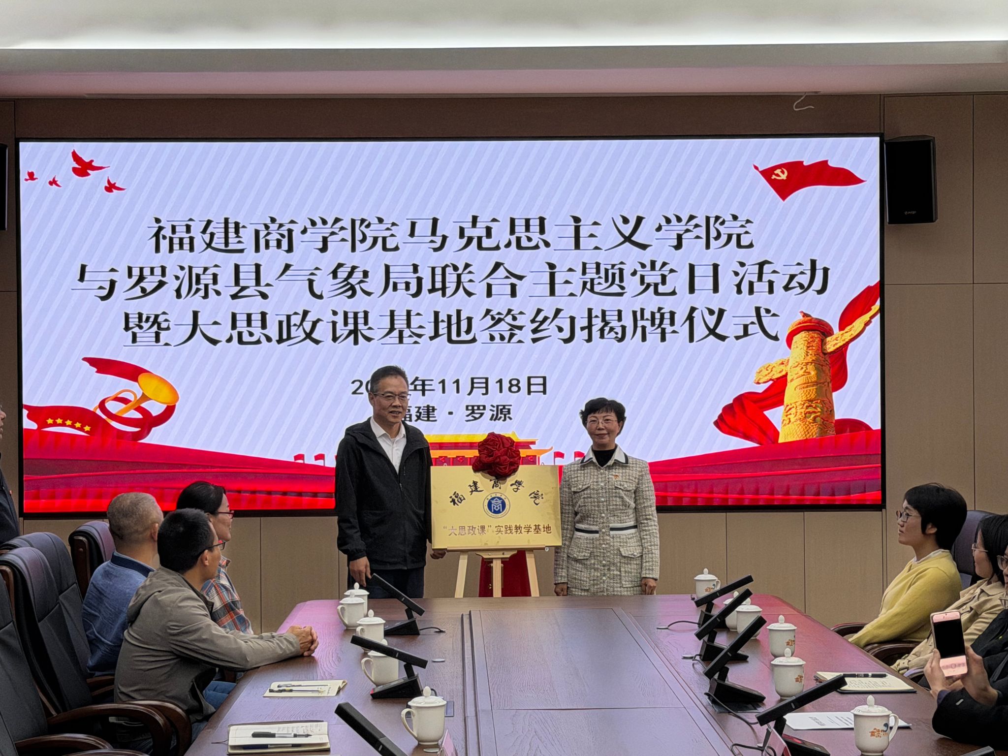 在共建“大思政课”实践基地签约揭牌仪式上,福州市气象局一级调研员陈兴旺希望双方加强交流协作,创新思政教育与气象生态研究、气象科普融合模式,在共学、共研、共享上下功夫、求突破、见实效,努力打造校地合作育人品牌。副校长林文艺表示,“大思政课”建设要与现实紧密结合、与实践深度融合,希望双方在学习贯彻落实党的二十届四中全会精神中,聚焦理论与实践融通、科研与教学打通,在课题攻关、主题讲座、学生实践等方面深化合作,实现校地资源共享、优势互补、共赢发展,助力增强思政课针对性和吸引力,助力青年学生成长成才。