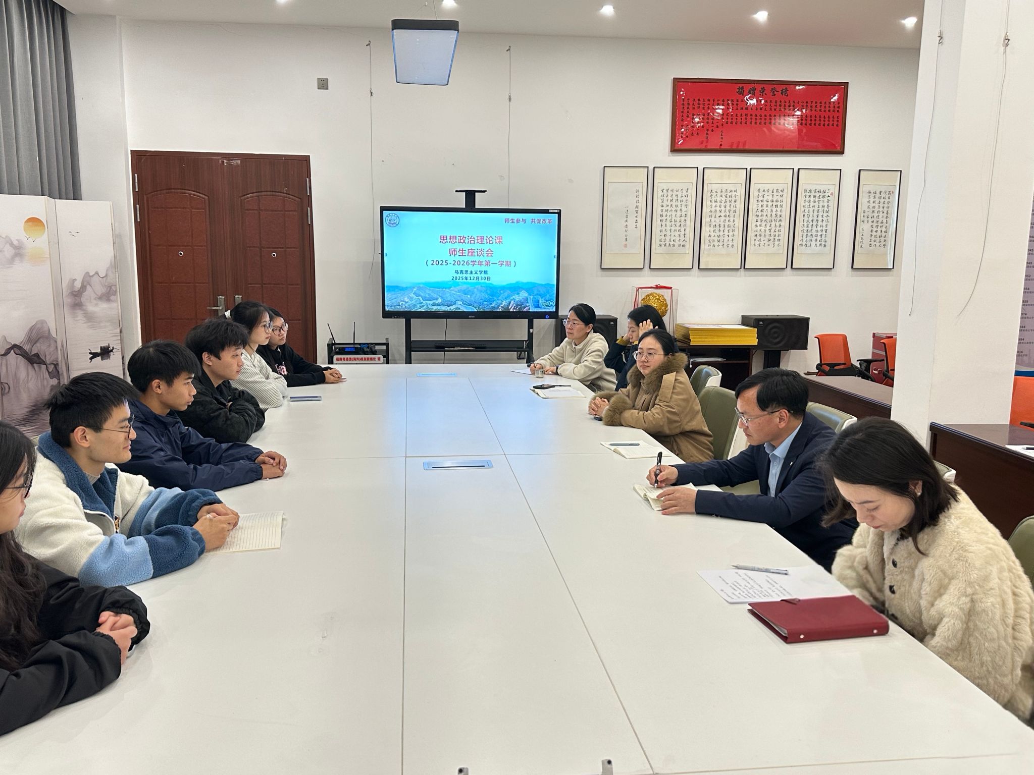 2025年12月30日,437ccm·必赢国际在鼓楼校区召开2025-2026学年第一学期思政课师生座谈会。教务处、质评处、437ccm·必赢国际有关人员,校院教学督导,437ccm·必赢国际各教研室主任参加座谈会听取学生代表意见建议。