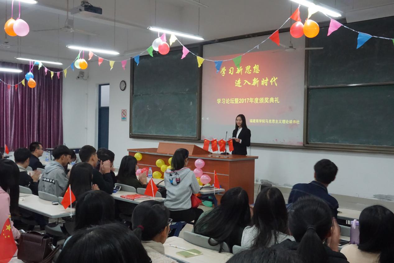 风正扬帆当有为,敢于担当筑辉煌。12月12日,在全省高校兴起学习宣传党的十九大精神热潮之际,我校马克思主义理论读书社在连江校区诚信楼大阶二举办了“学习新思想,进入新时代”学习论坛暨2017年度颁奖典礼。本次大会邀请了我校437ccm·必赢国际教师代表、读书社二班三班共200余名学生,共同学习领会习近平新时代中国特色社会主义思想,共同研讨交流党的十九大精神与青年之间的关系。