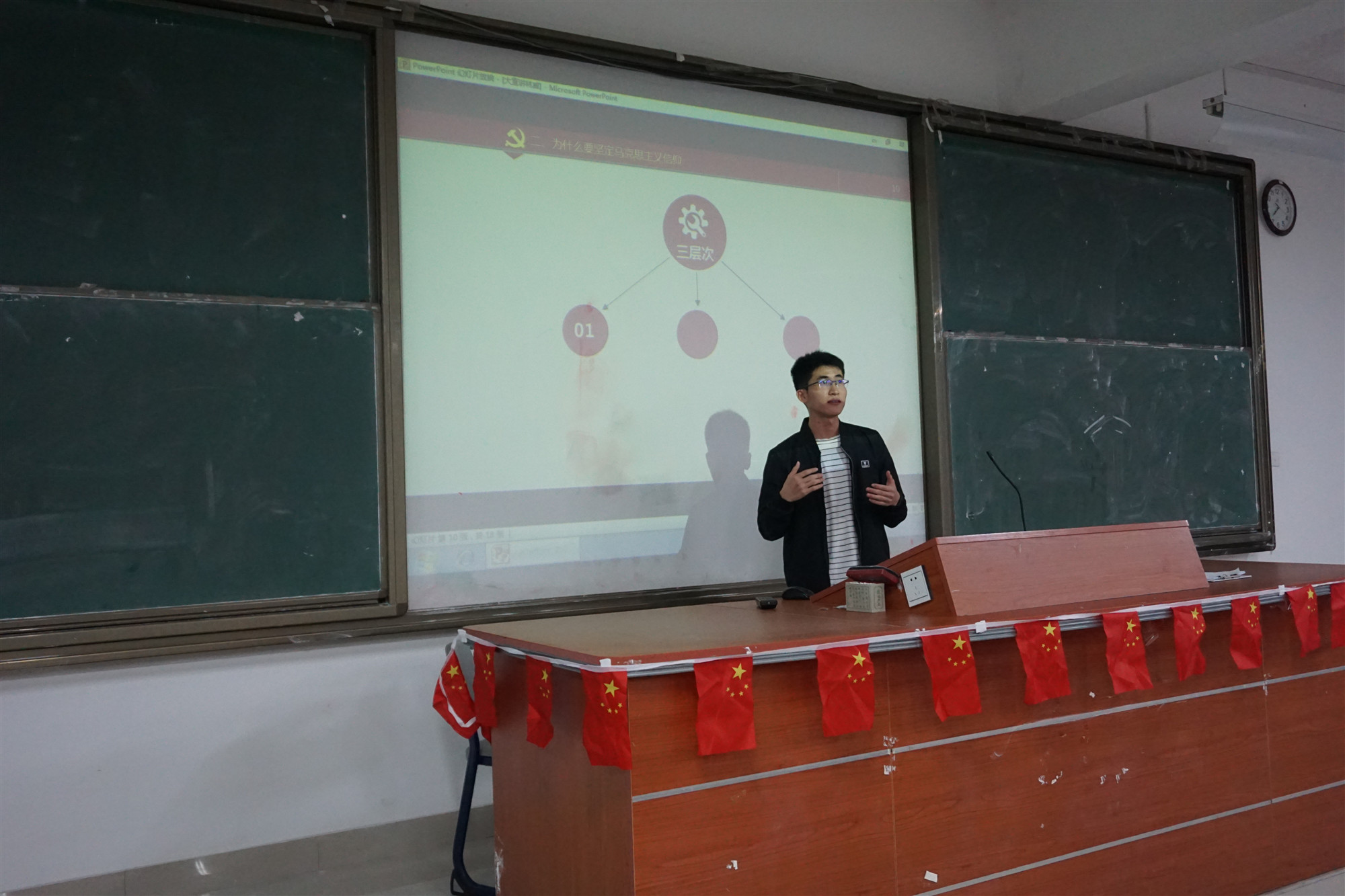 宣讲会上,林威同学首先引用习近平总书记在马克思诞辰200周年之际发表的重要讲话,即以“三个一生”、“三个飞跃”、“九个思想”和“后来的我们”引起思考,又以自身如何学习,一步一步成为预备党员的经历鼓舞同学们参加到学习中来。接着,林威同学开始切入正文,围绕四个话题进行宣讲。一,什么是马克思主义信仰?马克思主义信仰是一种科学信仰。从整个社会来说,它所追求的是共产主义理想;从每个社会个体来说,它所追求的是每个人自由、全面、充分的发展。二,为什么要坚定马克思主义信仰?青年大学生的信仰不仅仅是个人的私事,而是关乎社会稳定、国家发展、民族复兴的大事情。学习马克思主义,就掌握了分析问题、解决问题的有力理论武器;信仰马克思主义,就有了推动个体成长、国家发展、民族复兴的伟大力量。三,怎样坚定马克思主义信仰?就是要坚持一切从实际出发,理论联系实际、实事求是、具体问题具体分析,在实践中认识真理、发现真理,在解放思想、与时俱进中坚持真理、修正错误。四,新形势下我们如何在马克思主义伟大信仰的正确指导下,不辱时代使命,不负人民期望?就要做到爱国,忠于祖国,忠于人民。我们要励志,立鸿鹄志,做奋斗者;要求真,求真学问,有真本领;要力行,知行合一,做实干家。