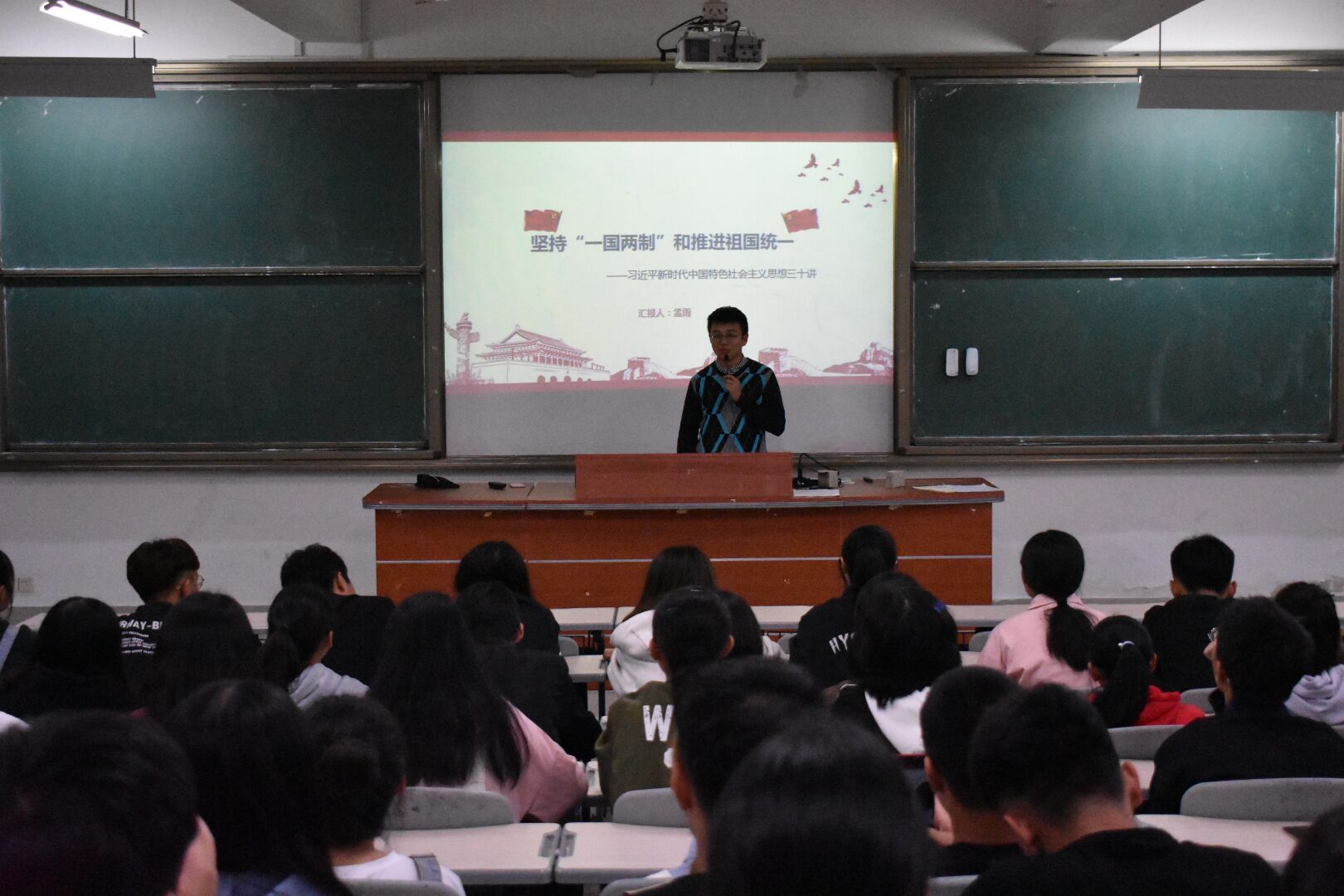 在宣讲活动上,陈安琪同学首先围绕“五四精神,永垂不朽”这一主题,深入剖析了五四运动对中国共产党的产生、发展有深远影响,让同学们充分认识到中国共产党党史与五四精神的重要性。陈安琪同学指出,习近平总书记在北京大学的师生座谈会给我们的启迪是鼓舞人心的;作为当代大学生,我们有责任坚持五四精神,传承五四思想。随后,孟雨同学以《习近平新时代中国特色社会主义思想三十讲》一书中的核心内容作为主要依据,展开对坚持“一国两制”和推进祖国统一的探讨。一国两制,即“一个国家,两种制度”,是中国政府为实现国家和平统一而提出的基本国策。坚持“一国两制”和推进祖国统一是实现中华民族伟大复兴的必然要求。孟雨同学列举西藏与印度交接处领土仍被占领、新疆和西藏两自治区交界处的土地争端、南海问题以及“台独”问题等例子,表明了我国和平统一的目标尚未完全实现,继续坚持“一国两制”原则为政治基础,坚决维护国家主权和领土完整,继续推进两岸各领域交流合作,为两岸同胞谋福祉既是我们的使命,也是我们的初心。
