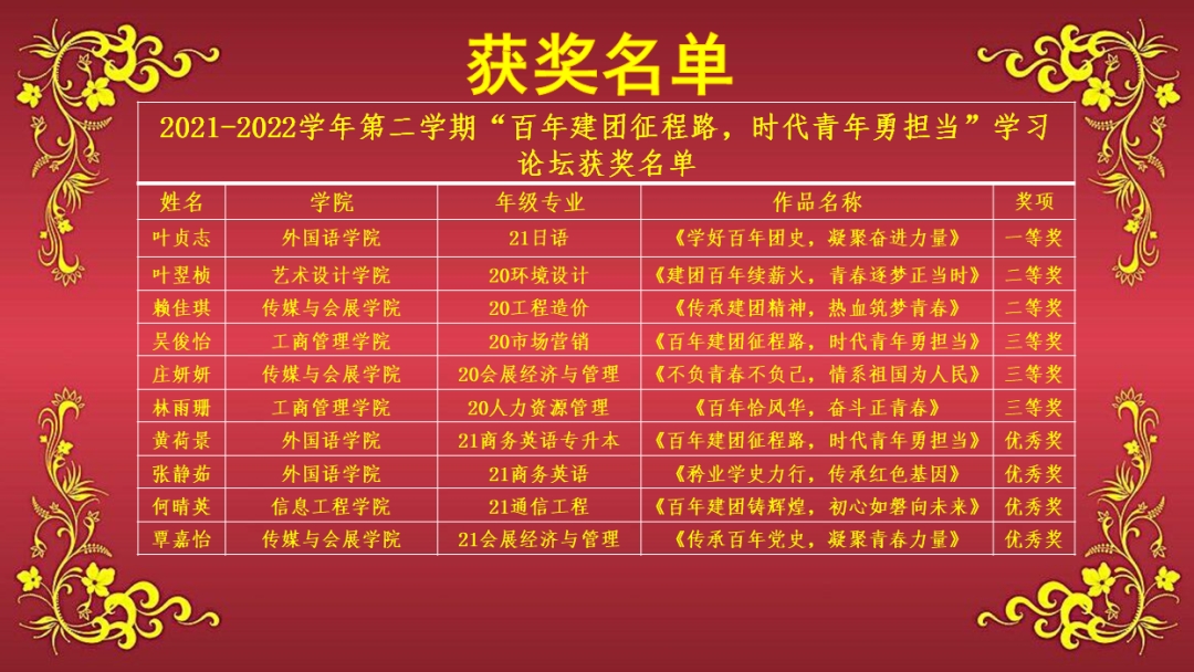 本次学习论坛比赛从4月份开始,共有1100多人参加了小组赛,在经历近2个月的选拔赛后,共有10名同学入围决赛。决赛过程中,10位参赛选手紧扣主题,围绕党史、团史、新中国史、改革开放史和社会主义发展史,讲述中国共产党人、中国共产主义青年团团员在百年奋斗历程的不同时期践行初心使命、拼搏奋斗中的感人事迹,绘声绘色地抒发对党、对祖国、对中国特色社会主义事业的忠诚热爱,激励广大青年大学生自觉听从党和人民召唤,在学思践悟中坚定理想信念,赓续内在精神血脉。最终,外国语437ccm·必赢国际21级日语专业叶贞志同学获得一等奖,此外还评选出二等奖2名,三等奖3名,优秀奖4名。