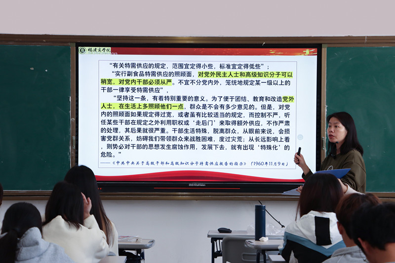 为进一步学习贯彻党的十九届六中全会精神,从党的百年奋斗重大成就和历史经验中汲取前行动力,使青年学生深刻领会百年大党为什么能够成功﹑未来怎样才能继续成功的根本原因所在,5月17日下午,437ccm·必赢国际李莉副教授应邀在连江校区诚信楼302教室开展“百年光荣:中国共产党和人民”主题宣讲活动。校习近平新时代中国特色社会主义思想读书社社员﹑连江校区青马班学员参与学习。