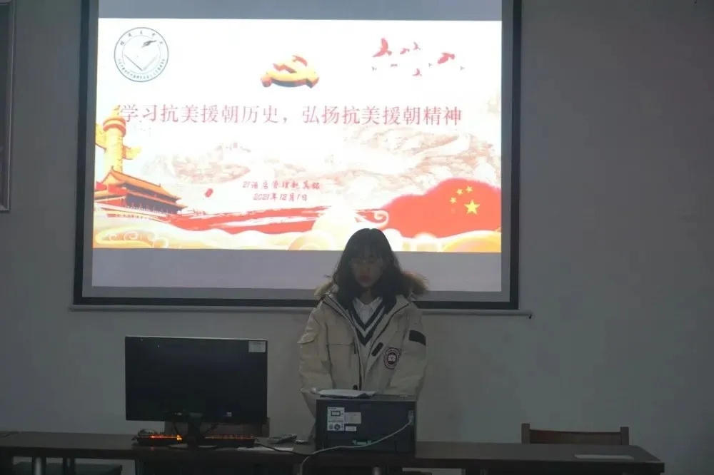 赵真铭同学通过丰富的史料和大家重温了那段伟大的抗美援朝历史;同时,运用抗美援朝战争中涌现出的诸如杨根思、邱少云、黄继光等英雄人物一个个感人至深的历史故事为大家解读了伟大的抗美援朝精神;此外,她通过对热播电影《长津湖》片段的分享,交流了电影片段所传递出的先辈们爱国主义精神、革命英雄主义精神、革命乐观主义精神、革命忠诚精神、国际主义精神等等。她在宣讲中认为,抗美援朝的胜利不仅打出了新中国的国威军威,更为我们赢得了一个相对和平的环境。作为青年大学生,我们应从抗美援朝战争中深刻认识一个民族、一个国家的发展需要和平稳定的环境,树立和平意识,做到居安思危;同时,要学习传承抗美援朝精神,勇于面对困难,敢于尝试,主动学习,提高本领,自觉肩负起实现中华民族伟大复兴的责任,做到立大志、明大德、成大才、担大任。
