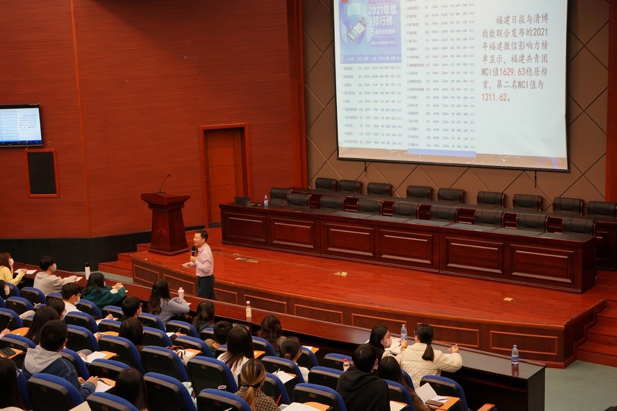 3月1日下午,我校2022年青马班专题学习讲座《全媒体时代:如何做好团的宣传工作》在马尾校区学术报告厅举行。本次讲座由团省委宣传部副部长周伟亮主讲,校团委老师、2022年青年马克思主义者培养工程培训班全体学员、校马列经典著作读书社社员﹑校团委新媒体运营中心学生骨干约200人参加讲座。