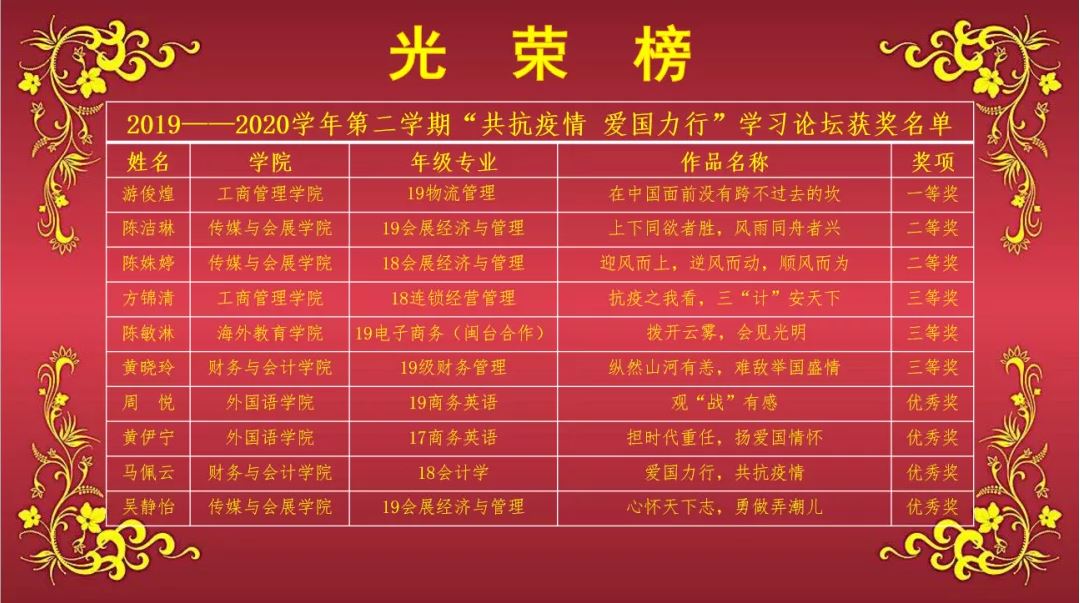 参赛选手围绕主题讲述抗击疫情中以医务人员为代表的各条战线彰显的“逆行者”精神和身边坚守一线、不怕牺牲、救死扶伤、无私奉献的英雄故事;宣传莘莘学子从我做起、加强自律、为社区服务、为群众分忧的青春故事。参赛选手的演讲紧扣主题、内容多样、角度新颖,有的讲述“逆行者”故事,生动感人;有的分享身边典型,激发大家共鸣;有的抒发爱国情感,引发师生思考。本次线上学习论坛历时一个多月,经过初赛、复赛、决赛的激烈角逐,共评选出10个获奖作品,工商管理437ccm·必赢国际19级物流管理专业游俊煌同学获得本次学习论坛一等奖,19级会展经济与管理专业陈洁琳等2位同学获得二等奖,18级连锁经营管理专业方锦清等3位同学获得三等奖,19级商务英语专业周悦等4位同学获得优秀奖。